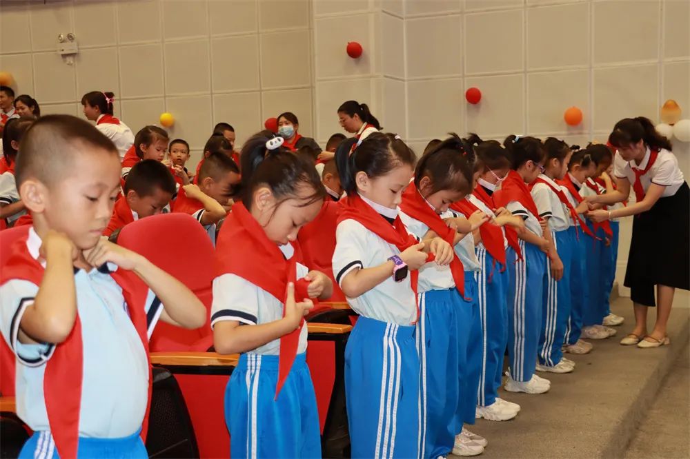新队员系上红领巾(符长雨 摄)此次活动由团县委、县教育局、县少工委主办,首都师范大学昌江木棉实验学校承办,向广大少先队员致以节日的问候和诚挚祝福,向为少年儿童健康成长辛勤耕耘的全县少先队辅导员和少年儿童工作者致以崇高的敬意。