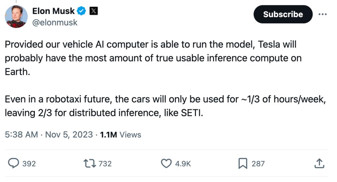 他发帖称:“如果我们的车载AI计算机能够运行Grok,特斯拉将可能拥有地球上最多的、真正可用的推理计算机。即便是在出租车上,汽车每周也只需要用1/3的时间规划行驶任务,剩下2/3的时间可用于分布式推理计算。比如 SETI(搜寻地外文明计划)。”