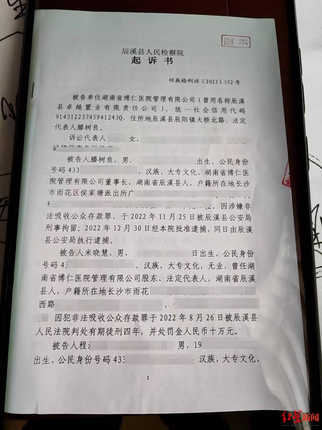 2002年,湖南省辰溪县人民医院被租赁给民营公司,为期40年。2022年,当地政府宣布提前收回医院经营管理权。一个月后,医院董事长滕树良涉嫌非法吸收公众存款被警方立案侦查,年底被批捕。不止社会人员,就连医院内部职工、一些公职人员及其家属,都曾借款给医院。辰溪县公安局出具的资料显示,截至2022年3月,该案集资债权人千余人,金额累计10亿余元。