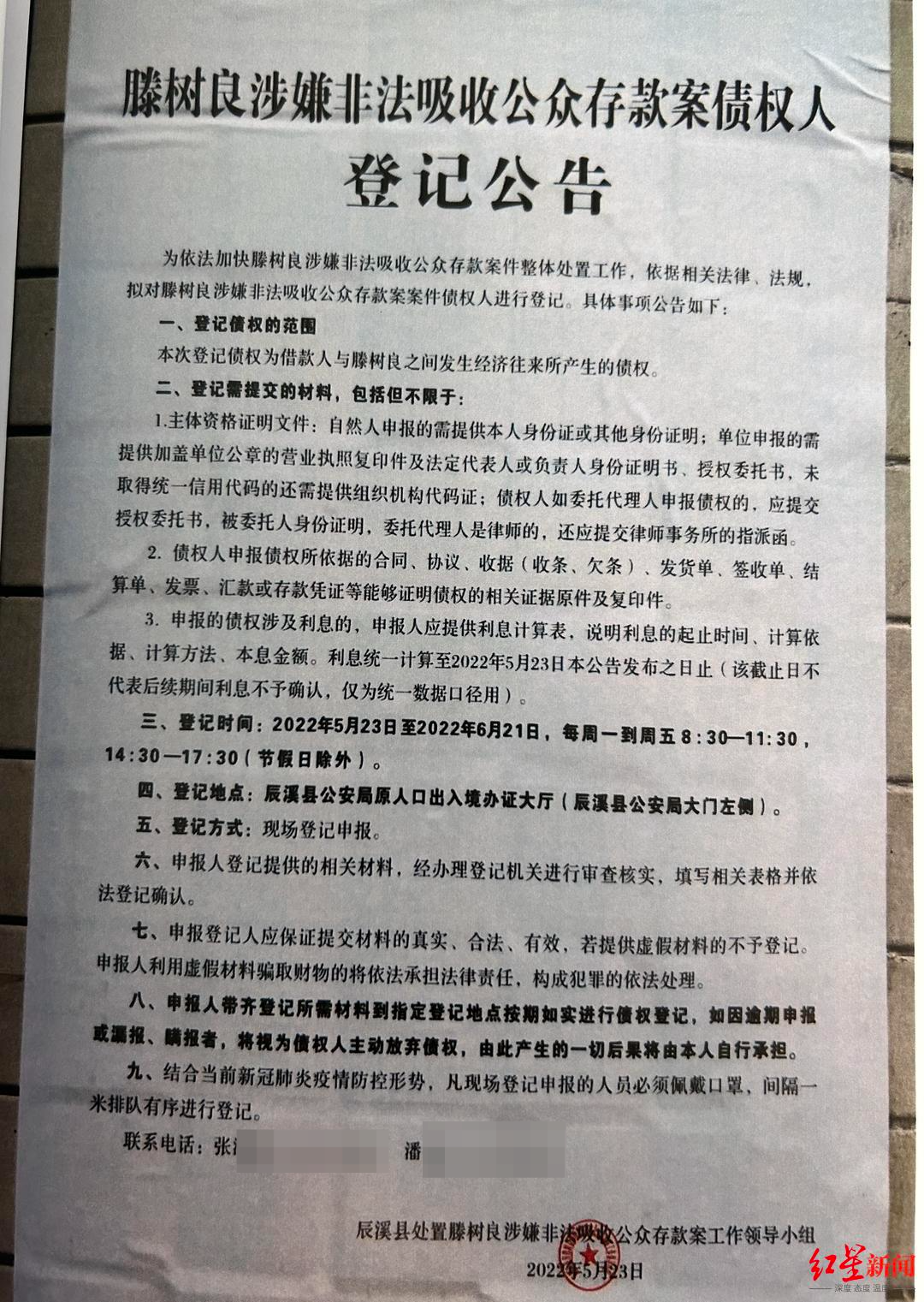 不少债权人认为,非法吸收公众存款案的犯罪单位是医院,滕树良是决策人,医院与滕树良是共同实施的犯罪,医院同样具有退赔义务。一名债权人回忆,2022年起,当地曾多次致电让他们进行申报登记,而公告仅将滕树良作为非吸案主体,不涉及医院,他犹豫了一个月,才决定进行登记申报,“公告写了,若不登记,将视为债权人主动放弃债权。”