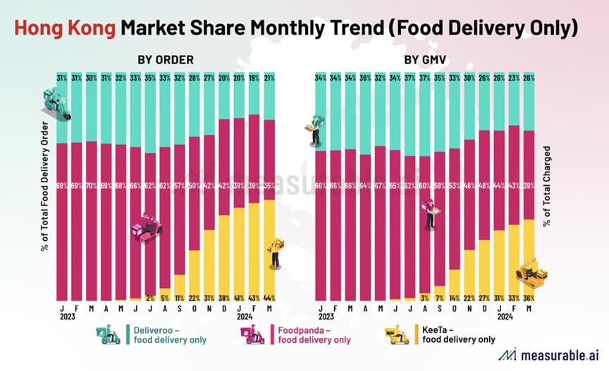 据Measurable AI统计,自2023年5月登陆香港以来,美团香港外卖品牌KeeTa单量市占率持续提升,今年3月餐饮外卖市场份额达44%,当地另外两家外卖平台Foodpanda、Deliveroo的市占率分别为35%、21%。