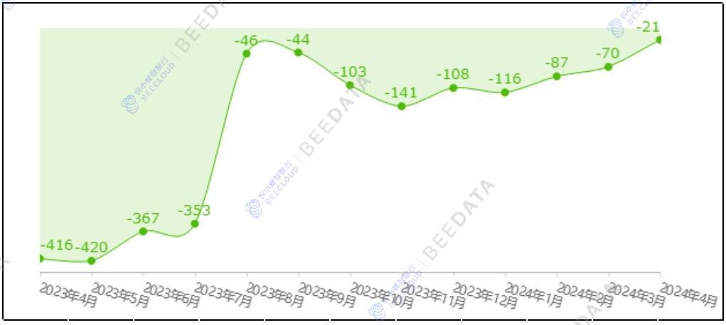 (数据来源:国家发展和改革委员会制图:农小蜂)从具体数据来看,2023年4月~2024年4月,全国散养生猪“每头净利润”从-416元波动至-21元;亏损金额在21~420元之间不等,其中,2023年5月亏损相对最高,2024年4月亏损相对较小。