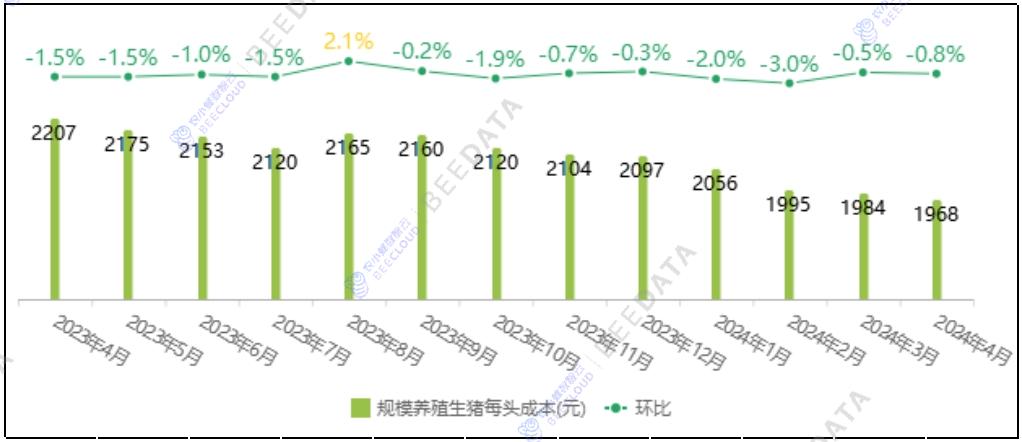 (数据来源:国家发展和改革委员会制图:农小蜂)从近13个月监测数据来看,2023年4月~2024年4月,全国规模养殖生猪“每头成本”从2207元波动至1968元,每月对应的环比上涨/下跌幅度也由-1.5%波动至-0.8%;峰值为2023年4月的2207元,谷值为2024年4月的1968元;主要在2023年8月出现过环比上涨趋势,其余监测时间节点均呈现环比下跌趋势。