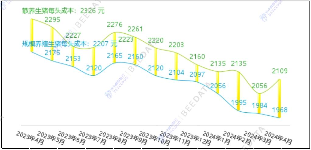 2024年4月,全国规模养殖生猪平均“每头成本”(1968元)与散养生猪平均“每头成本”(2109元)相差141元,与上月相比,差距进一步扩大。