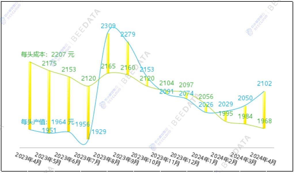 2024年4月,全国散养生猪“每头净利润”为-21元,与上月相比,亏损有所收窄。
