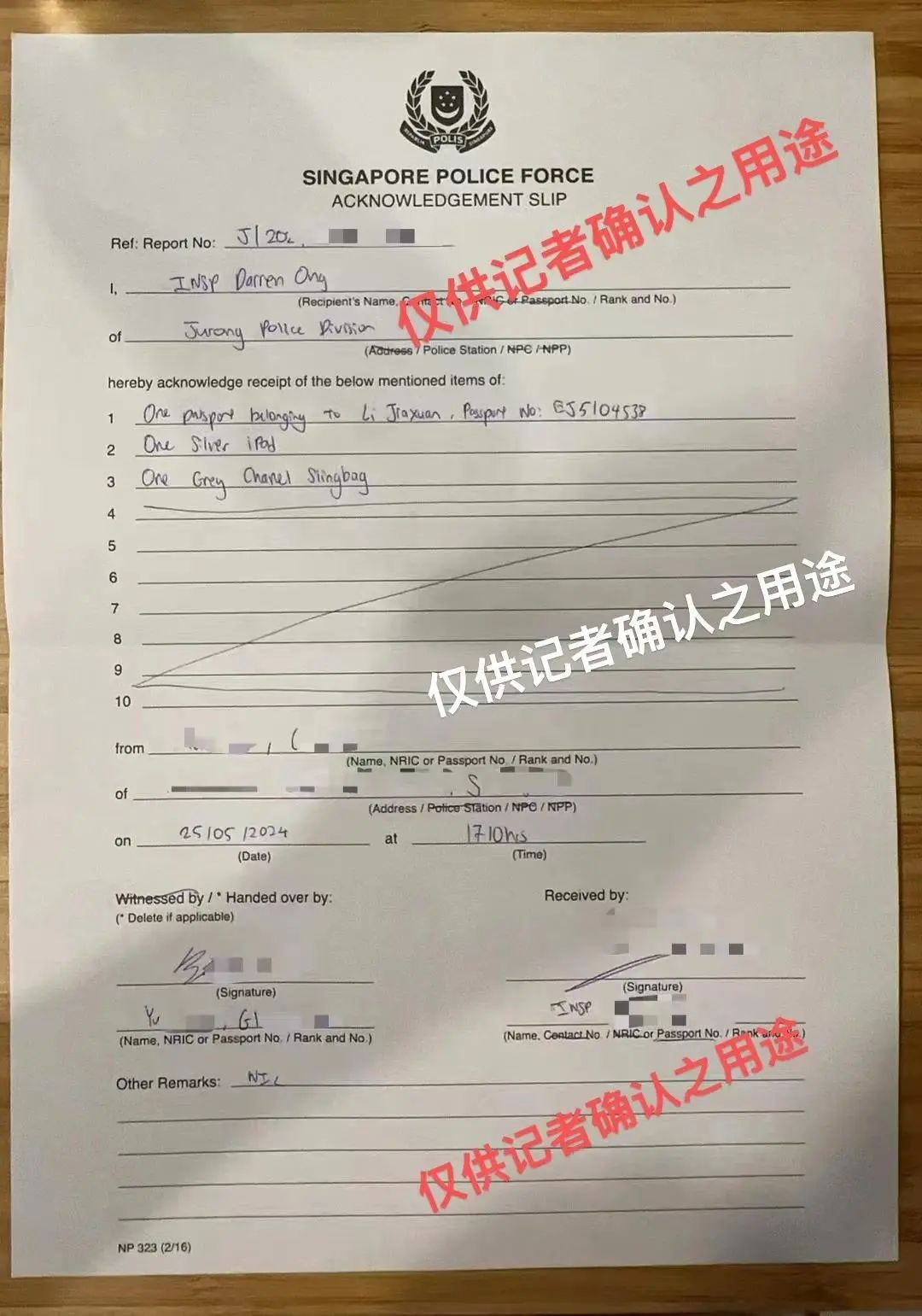 新加坡警方收到李佳轩的iPad等物品后出具的回执单男友称其曾哭诉惧怕父亲