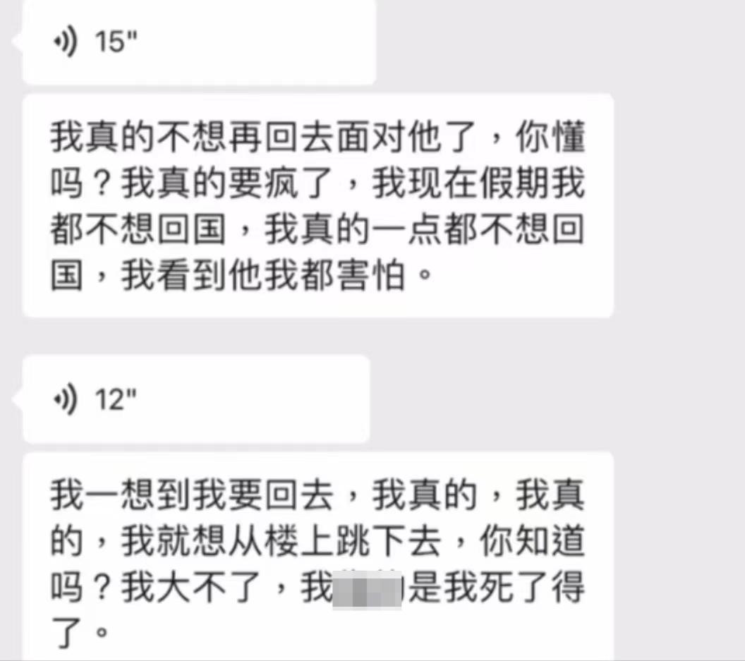 李佳轩称自己害怕假期回家见到父亲张成对红星新闻记者说,两人交往期间,女友曾“向我哭诉过非常害怕在6月1日毕业后,回国面对父亲,甚至与父亲同住。”