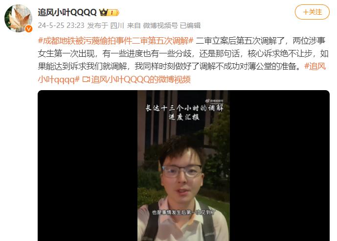 去年发生的“成都地铁被污蔑偷拍案”再起波澜。5月25日,案件当事人何先生在其微博账号@追风小叶QQQQ 发布视频,称“二审立案后第五次调解了,两位涉事女生第一次出现,有一些进度也有一些分歧”。