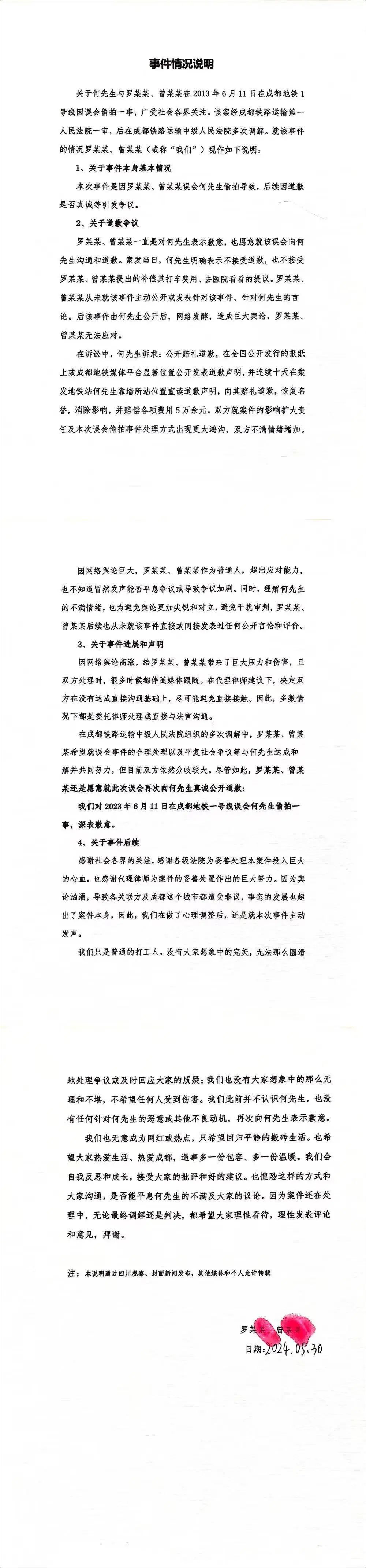 尽管如此,罗、曾二人还是愿意就此次误会再次向何先生真诚公开道歉:我们对2023年6月11日在成都地铁一号线误会何先生偷拍一事,深表歉意。