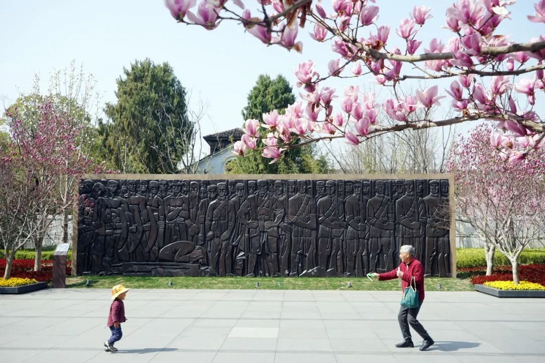 春天白玉兰花开,浮雕《忠魂》已成为游客游园打卡圣地。供稿:周正