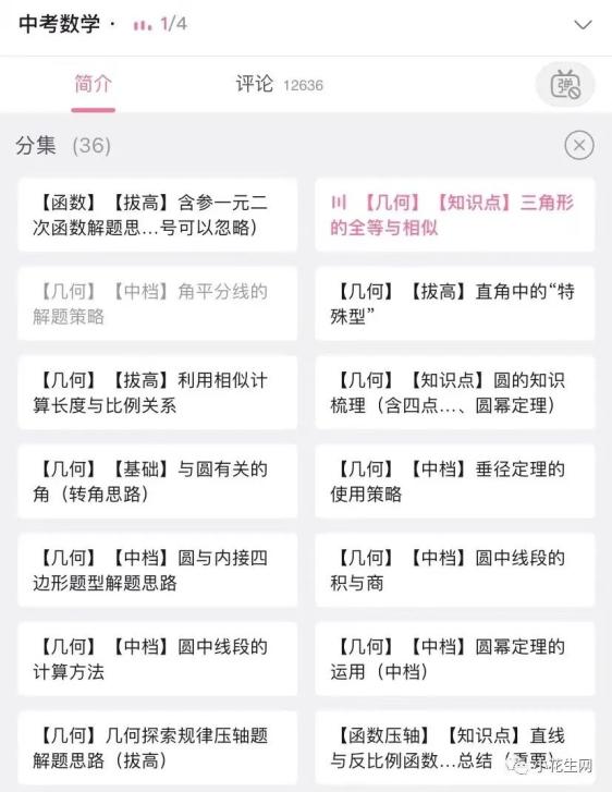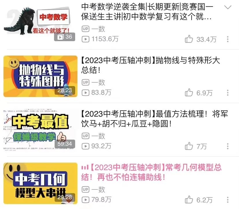 单单“中考数学逆袭全集”的播放量就超过了1000万,另外还有“中考数学每日一题合集”、“单独精华视频专题”、“实战中考试卷”、“初中数学学习方法”等系列都非常受初中生欢迎。