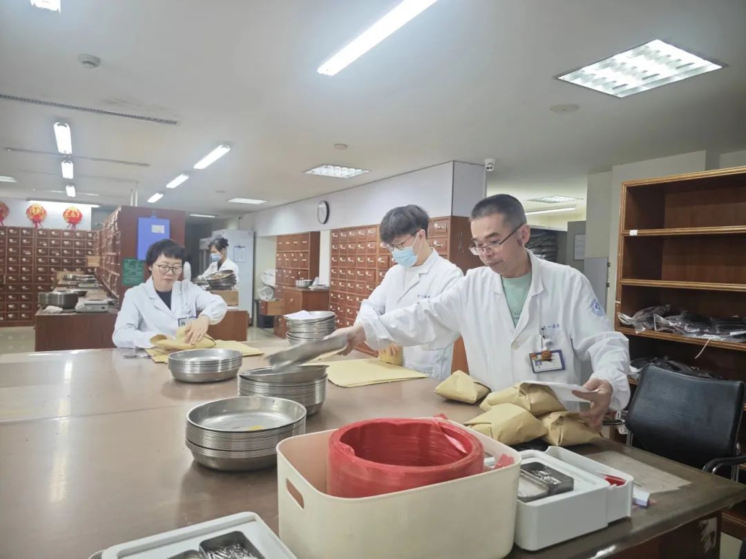 29日上午9点多,区一医院中药房工作人员就已经忙开了。桌上一张张包药纸上放着称好的药材:乌梅、山楂、陈皮……工作人员手脚麻利,快速将药材包成了一个个小包裹。