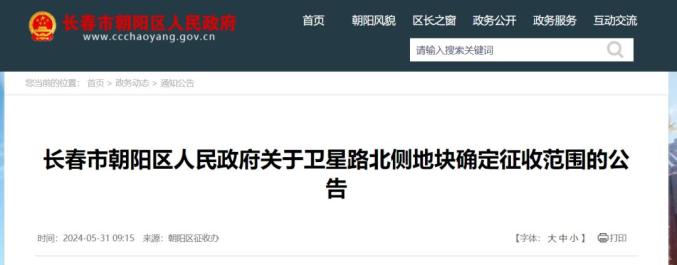长春市朝阳区人民政府关于卫星路北侧地块确定征收范围的公告