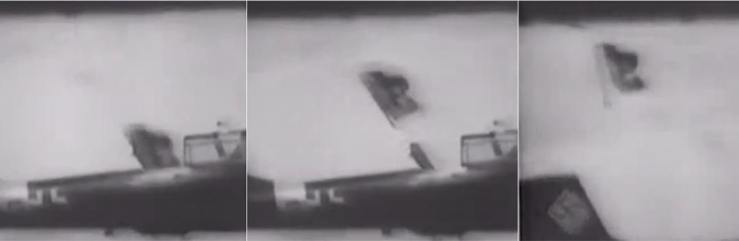 上图为“二战”时期,德国工程师们申请的诸多弹射座椅专利中的一个;下图为“二战”德国战机上使用弹射座椅的连续画面,弹射座椅从座舱中弹出、跃过飞机的垂尾。最初的弹射座椅是以弹簧或压缩空气作为弹射出舱的动力源,尽管当时技术条件有限,但这在飞行员的救生方式上已是很大的进步。