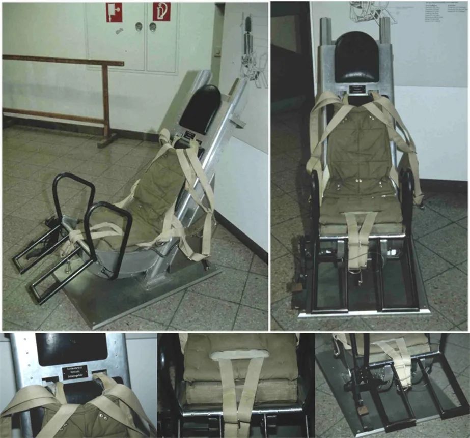 “二战”德国准备为He-162喷气式战斗机配备的压缩空气式弹射座椅。压缩空气式弹射座椅存在着压缩空气容器重量大、弹射能量小等先天不足,因此以火药为弹射动力成为当时弹射座椅的另一条技术路线。