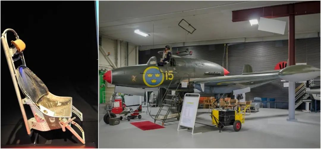 瑞典萨博(SAAB)公司在1941年为萨博J-21战斗机研制配套的弹射座椅时,就从压缩空气动力转为火药动力。博物馆中的这架萨博J-21战斗机还原了弹射座椅弹射出舱的情形。战后,随着喷气时代的到来,飞机的速度越来越快、直至突破了音障,飞行员再以过去纯靠自己、手动方式跳伞来逃生是不可能的了,对弹射座椅的需求愈加迫切。