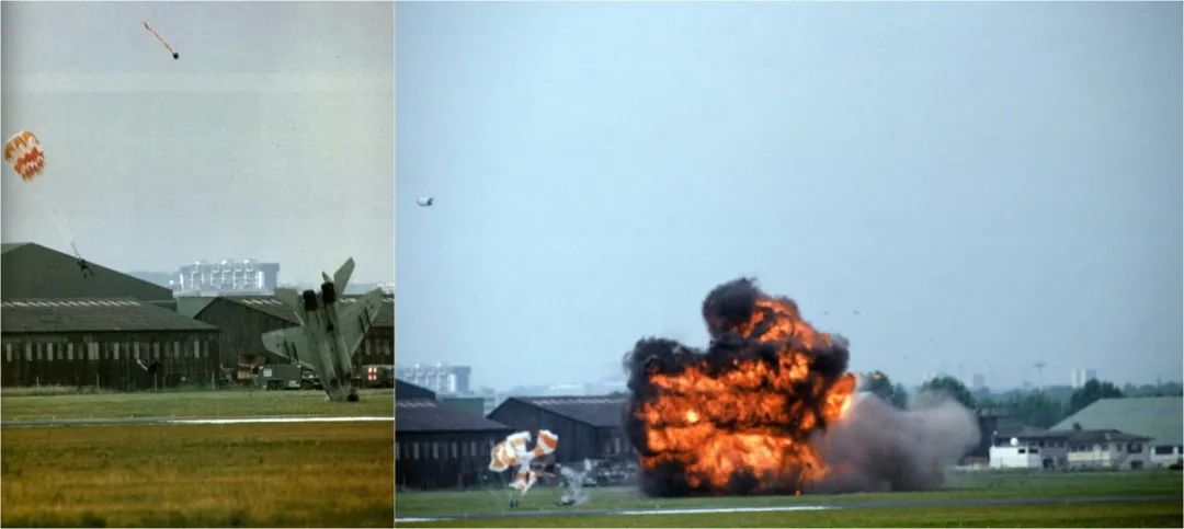 上图为1989年6月8日,巴黎航展上飞行表演的米格-29战斗机因为发动机吞鸟起火,飞行员在飞机触地前2.5秒果断弹射,并最终安全降落在了坠机爆炸火球30米处。这次极其不理想的状态下的弹射成功,苏联/俄罗斯红星设计局K-36D弹射座椅的表现惊艳世人。