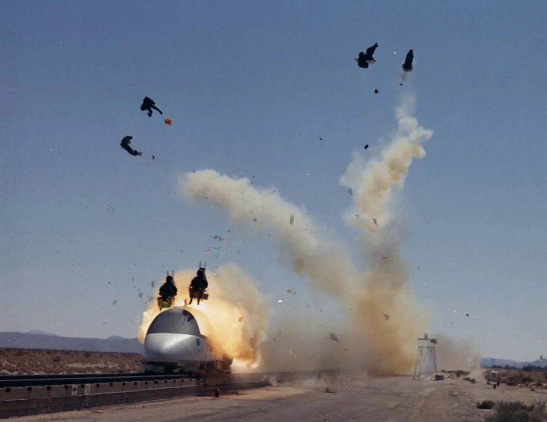 下右图为展开的相关假人试验测试。弹射座椅还曾救了“登月第一人”一命。1968年5月6日,尼尔·阿姆斯特朗在进行模拟登月训练,他在操控1号登月训练车模拟月球下降过程时,用于加压燃料箱的氦气意外耗尽导致失去控制。阿姆斯特朗在离地面约200英尺(60米)的地方使用了“韦伯弹射座椅”弹射救生,他唯一受的伤只有舌头咬破了。
