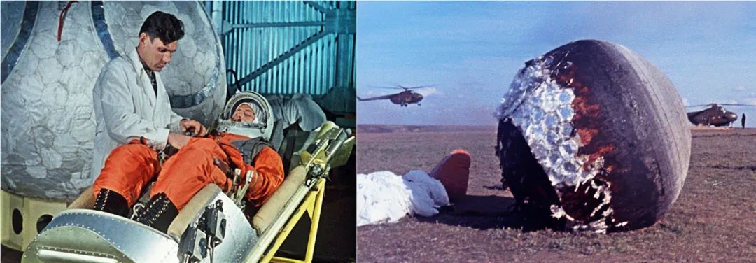 塔斯社发布的加加林在“东方”号的弹射座椅上测试训练画面和重返地球的“东方”1号返回舱画面,可见舱壁上的“大洞”、加加林早已跳伞落地。