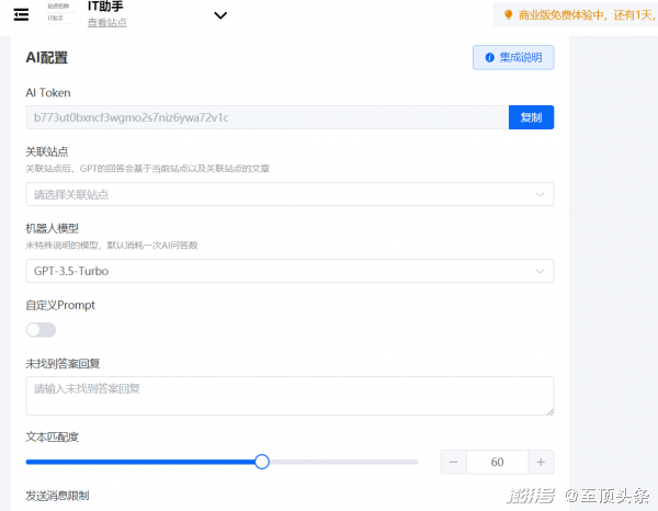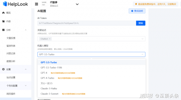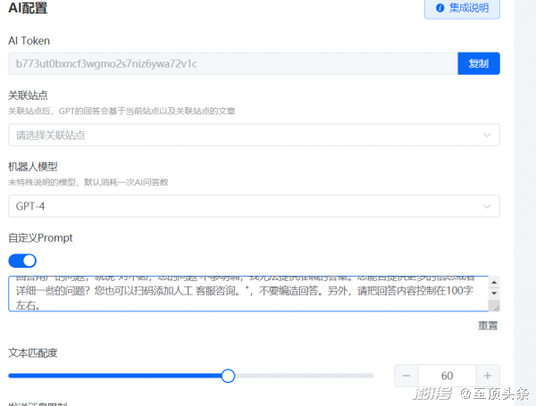 接下来的任务就是交给AI知识库平台了。你只需要你把企业的各类知识进行收集和整理,确保数据越来越完善,然后把数据喂给AI知识库。AI知识库平台通过数据清洗和整理,实现信息整合和AI检索能力。对于企业需求越明确,知识库的功能和应用场景越完善。首先我们来看helplook的AI配置选项,主要包括模型选择和自定义prompt选项。