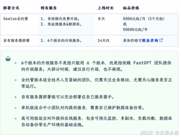 不过部署和维护FastGPT依然需要一定的专业技术知识,对于没有技术基础的小白用户来说,存在学习成本,而且开源版本在功能体验上比每月5000元的Sealos全托管商业版差了一大截。