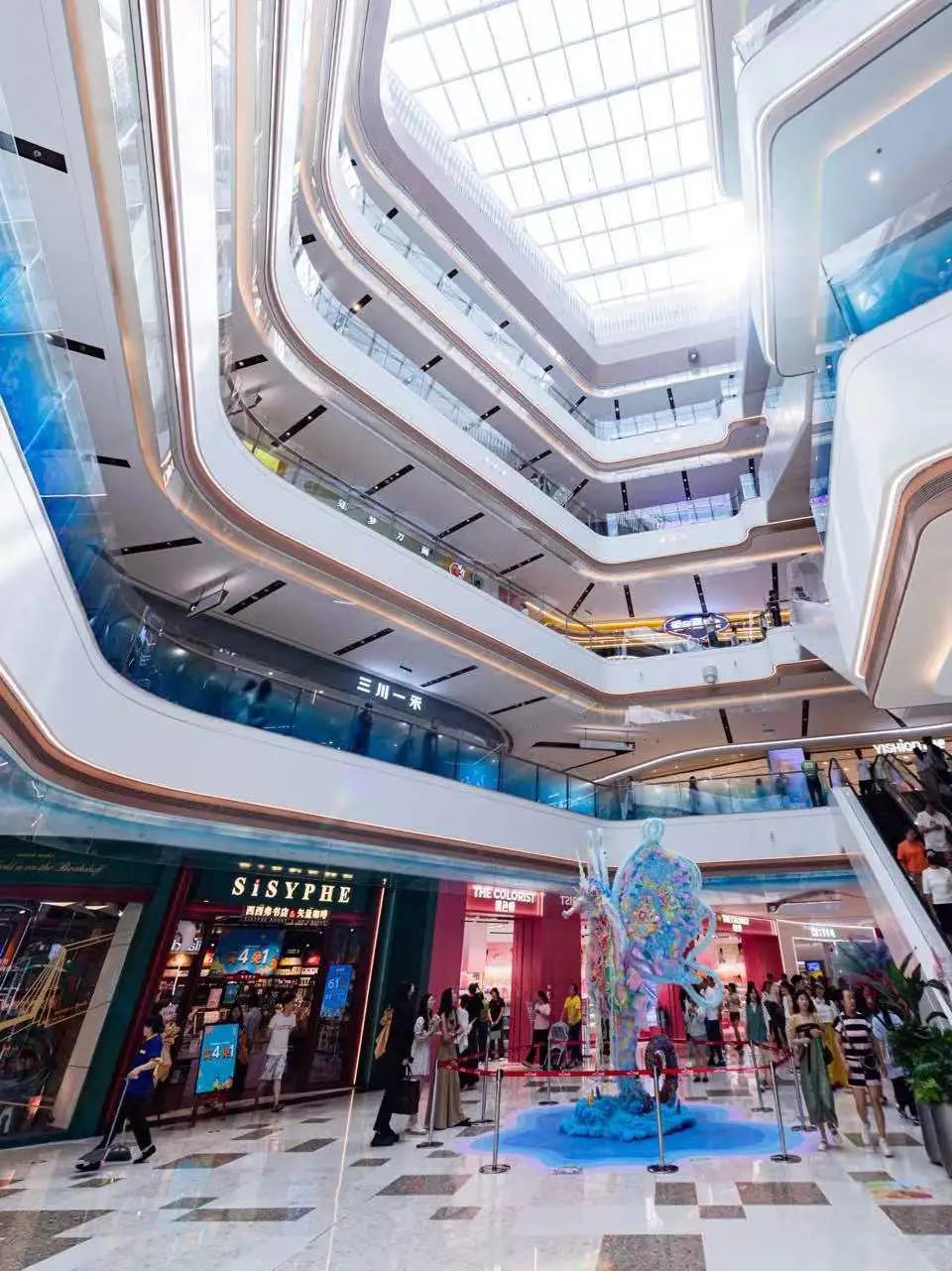 温江旭辉Cmall的整体设计灵感来自文化遗产“蜀锦”和代表当地河流和自然景观的汉字“川”。设置了六大主题场景,打造多元、开放、潮趣、时尚的社交场景。
