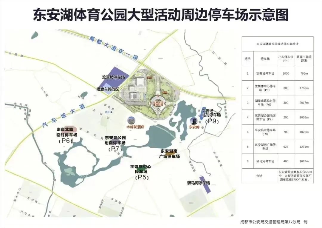 6、汽车城大道三段西侧辅道临时停车区:车头朝南,散场时车辆经汽车城大道东安湖下穿或蜀都大道东一段疏散。