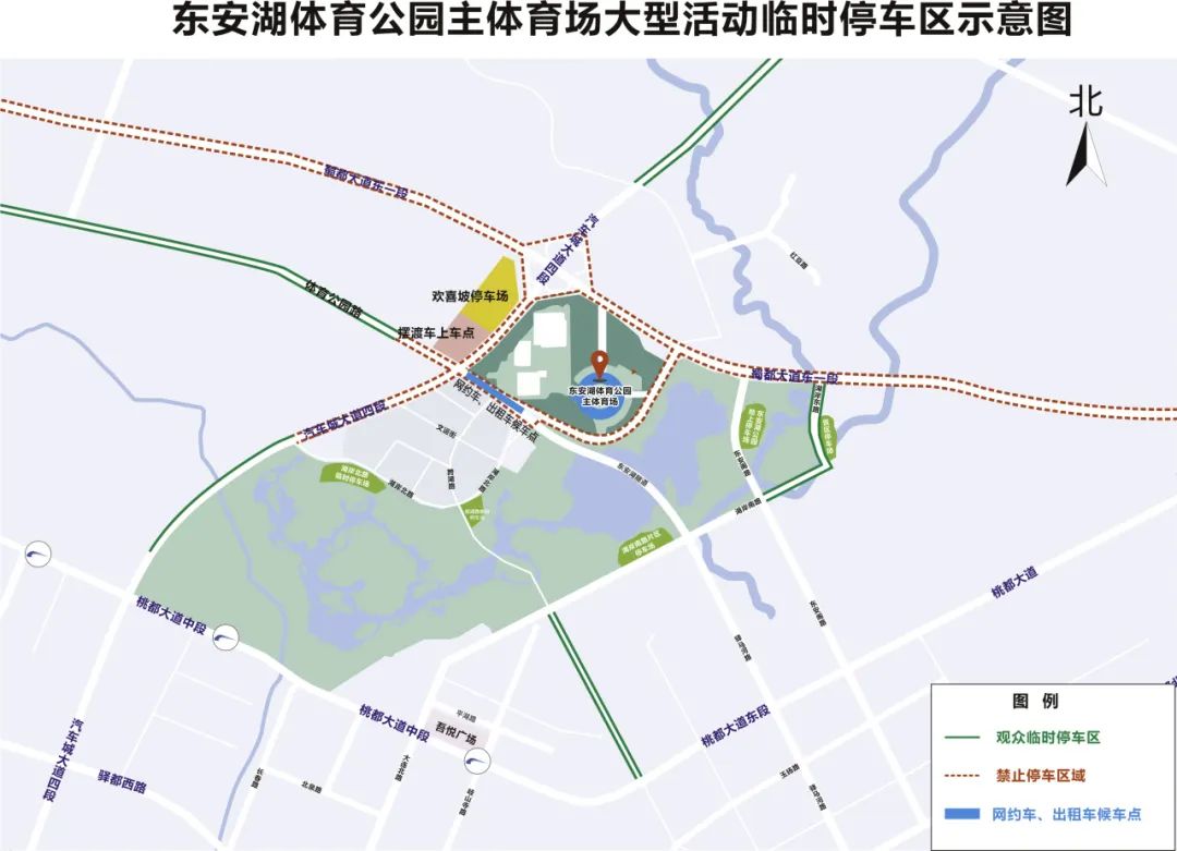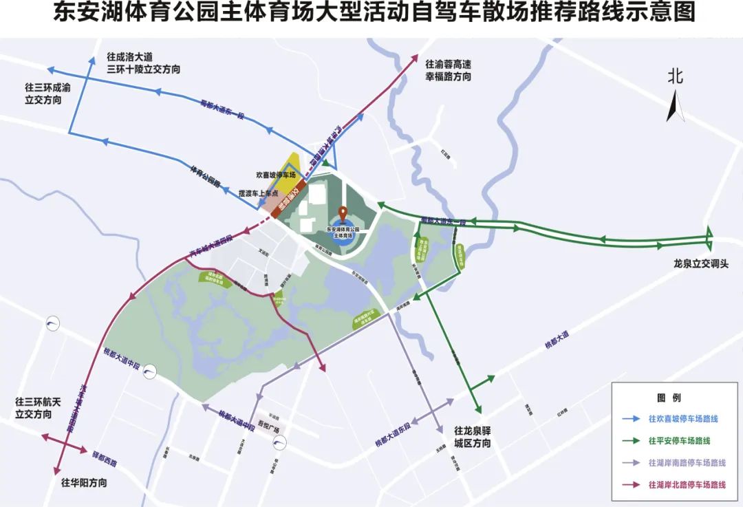 5、汽车城大道四段(龙兴路口以北)西侧辅道临时停车区:车头朝南,散场时车辆经汽车城大道→驿都大道或成龙大道疏散。