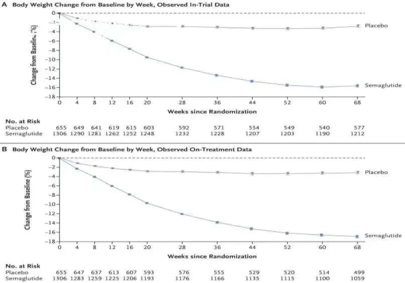 早在2021年3月,医学顶刊之一《NEJM》发布的全球性重磅临床试验显示:仅需每周给药一次2.4mg,司美格鲁肽使得肥胖参与者的体重狠狠地下降了15.3kg!在整个试验期间,有将近七成的参与者体重减轻了10%以上,而降低15%以上的人数超一半。