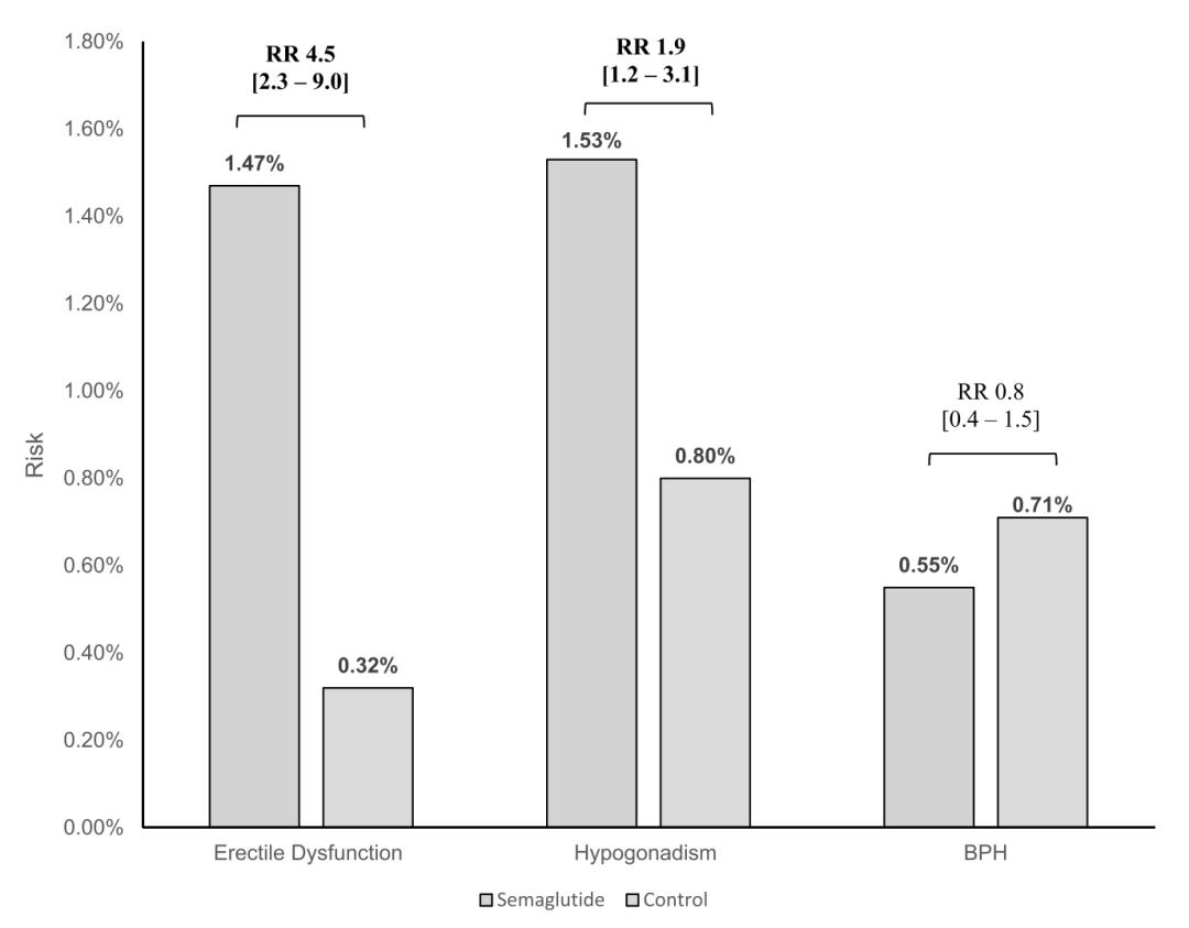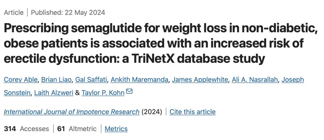 [3]Able, C., Liao, B., Saffati, G. et al. Prescribing semaglutide for weight loss in non-diabetic, obese patients is associated with an increased risk of erectile dysfunction: a TriNetX database study. Int J Impot Res (2024). https://doi.org/10.1038/s41443-024-00895-6