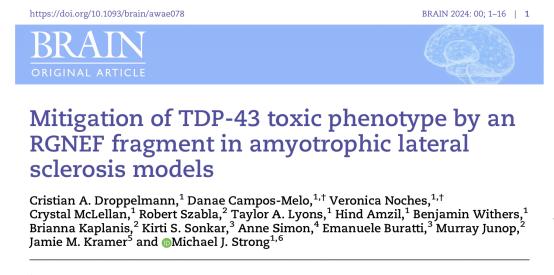 参考文献:Droppelmann, Cristian A., et al. “Mitigation of TDP-43 Toxic Phenotype by an RGNEF Fragment in Amyotrophic Lateral Sclerosis Models.” Brain, May 2024, p. awae078. Silverchair, https://doi.org/10.1093/brain/awae078.
