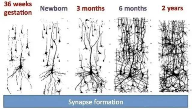 36 周的胎儿、新生儿、3 个月、6 个月、2 岁时,大脑的神经突触网络研究发现,3 个月的婴儿就能记住一个视觉刺激(例如人脸)长达 24 小时,半岁以后就能记事儿了。