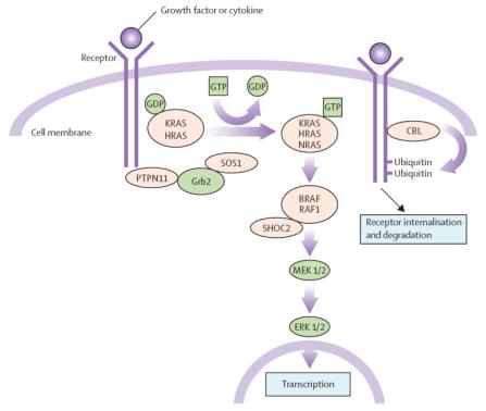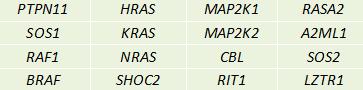 那么,是什么原因引起的Noonan综合征呢?Noonan综合征是一种遗传综合征,最早被认为是常染色体显性遗传,随着越来越多的致病基因被发现,也有少数病例是常染色体隐性遗传。Noonan综合征的发病机制与人体内一个重要的细胞信号转导途径RAS-MAPK通路的信号上调有关【图1】,这条通路可将生长因子、细胞因子、激素等细胞外信号转导至细胞内,促进细胞的增殖、分化、代谢等。与Noonan综合征相关的致病基因均编码RAS-MAPK通路中的重要蛋白。从2001年发现首个Noonan综合征致病基因PTPN11到现在,研究者们已经发现了至少16种与Noonan综合征发病相关的基因变异【表1】。