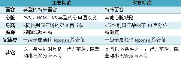 Noonan综合征的临床表现非常多样,可以累及人体的多个器官系统。除了前面所述的特殊面容、身材矮小、先天性心脏病、胸廓畸形以外,其他的临床表现还包括不同程度的发育迟缓、颈宽、颈蹼、隐睾、凝血功能障碍、淋巴管发育不良以及眼异常等,部分患者伴有轻度的智力障碍、语言障碍【图2】。目前对Noonan综合征的诊断仍然主要依靠临床诊断标准,最常用的是荷兰学者van der Burgt于1994年提出的,包括面容、心脏、身高、胸廓、家族史、其他等6个方面的主要和次要标准【表2】。如有典型的Noonan综合征的特殊面容,只需达到其它1条主要条件或2条次要条件。如面容特征仅提示Noonan综合征,则需达到其它2条主要条件或3条次要条件。