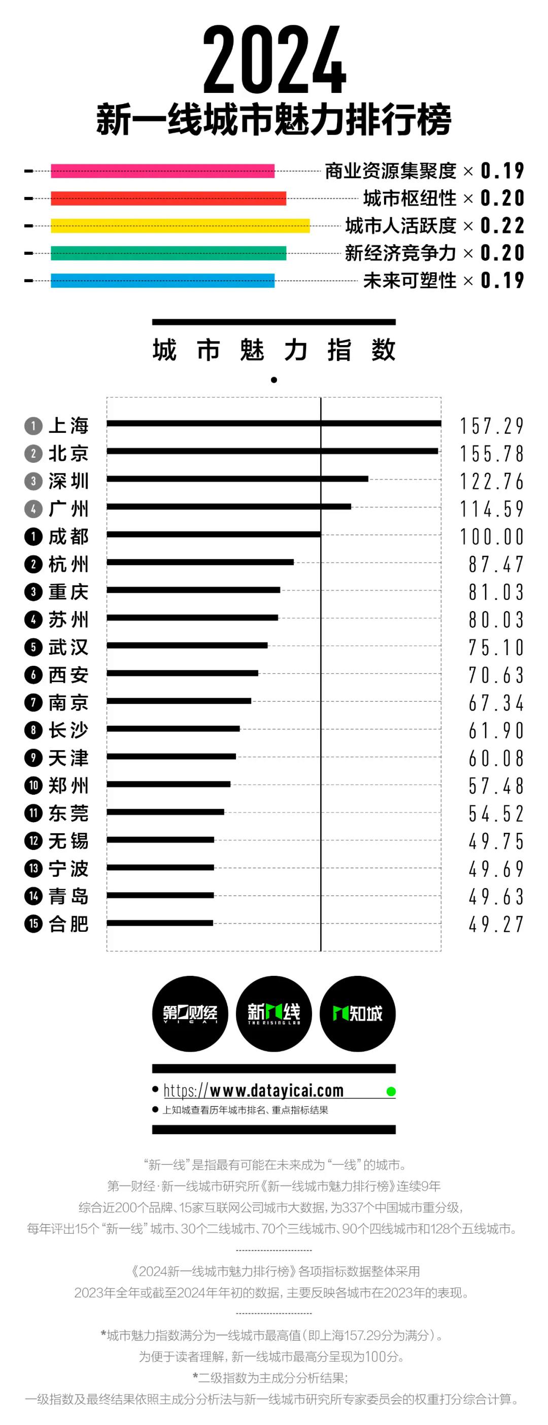 《新一线城市魅力排行榜》的指标体系包含了商业资源集聚度、城市枢纽性、城市人活跃度、新经济竞争力和未来可塑性五大一级维度。榜单的一级与二级维度权重以新一线城市研究所专家委员会打分的方式计入,二级维度以下指标数据则采用主成分分析法。榜单各细分维度指标主要采用2023年全年或者截至2024年年初的数据计算得出。