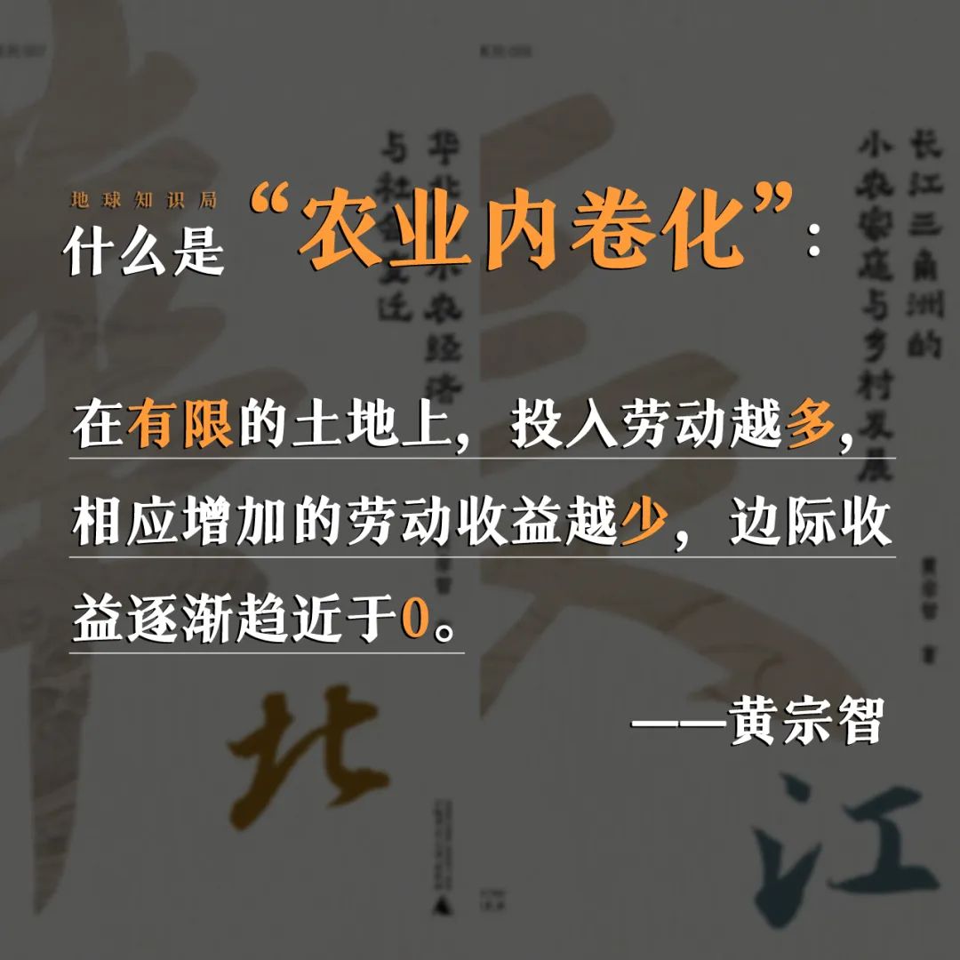 后来黄宗智将这一概念引入,描述中国的农村状况,写了两本书,一个是《华北的小农经济与社会变迁》,一个是《长江三角洲小农家庭与乡村发展》。概念的本意是,在有限的土地上,投入劳动越多,相应增加的劳动收益越少,边际收益逐渐趋近于0。
