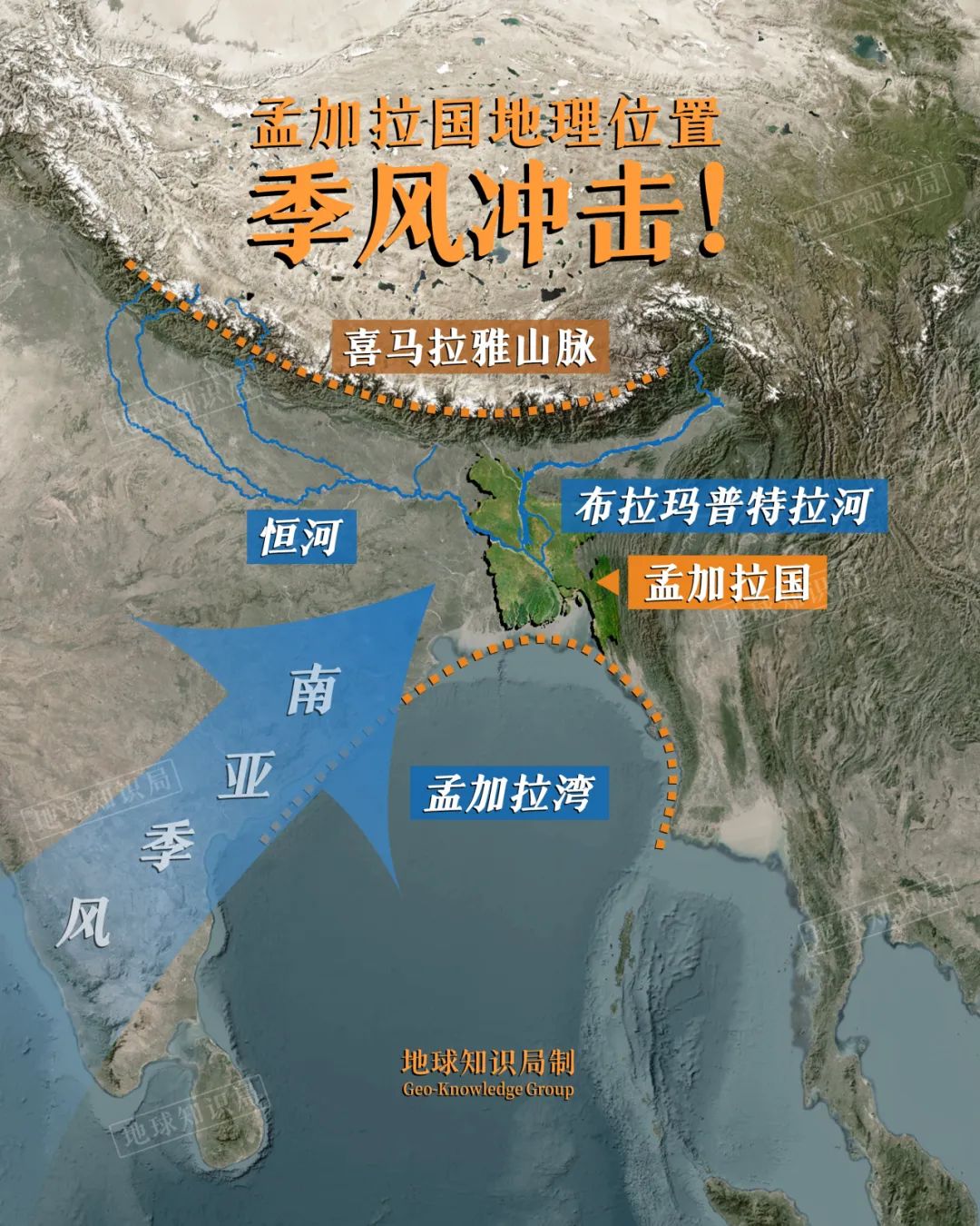 放眼整个南亚+东亚季风区,孟加拉湾向北弯曲,喜马拉雅山向南弯曲,孟加拉国位于其中的“腰部”位置,这里面积不大,却是喜马拉雅山一线绝大部分河流的入海口,相当于承受了南亚季风的全面冲击。