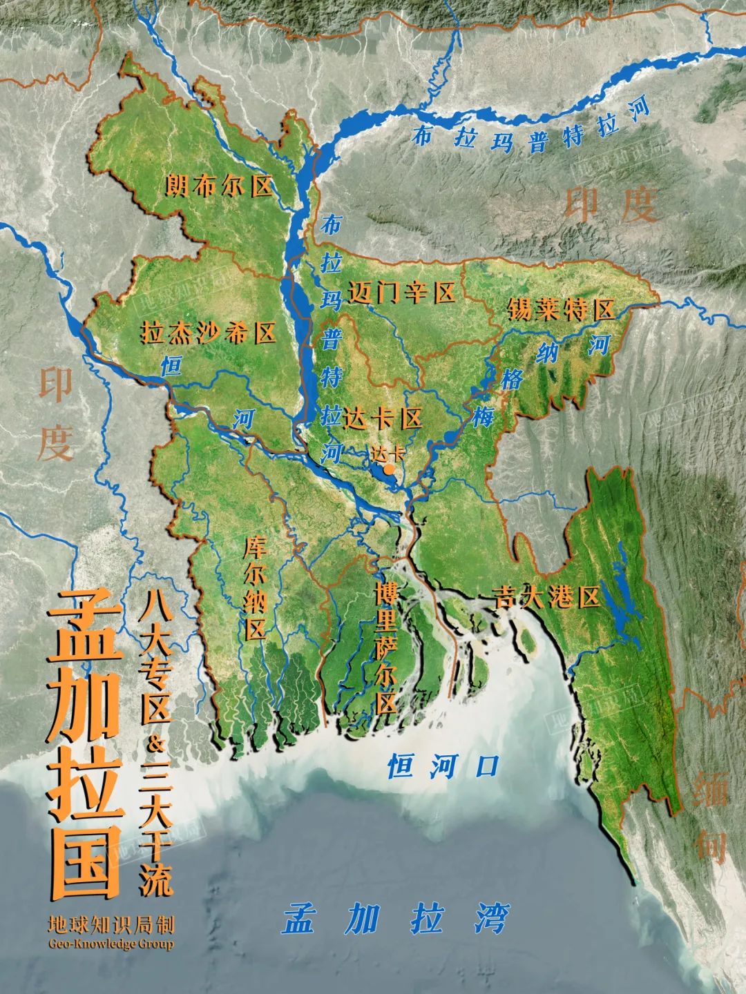 所以这个国家的水系,从北到南,都显得过于粗壮且混乱。恒河、布拉玛普特拉河、梅格纳河这三条巨大的干流将土地分成几个大块,全国八大专区也基本以此划分,如果按中国的起名习惯,甚至可以称之为“河间”、“河西”、“河东南”、“海口”......