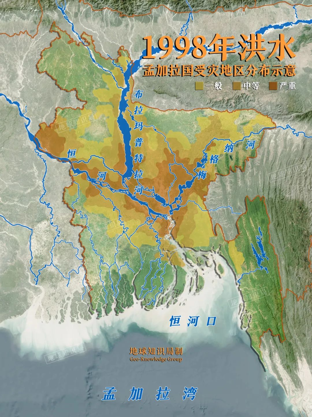 这三条大河动不动就有5-8公里宽,比长江要宽得多,如同流动的湖泊,而且像鄱阳湖一样,雨季和旱季变化很大,水面可以在20天内从一两公里扩张到十几公里,靠近喜马拉雅山脉的“河东北”山洪灾害最为严重。1998年,孟加拉国三分之二的面积被洪水淹没,导致3000万人流离失所,1000余人死亡,粮食损失450万吨,相当于当时年产量的14%。