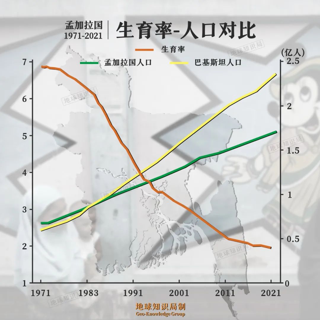 孟加拉国其实也用过马寅初的方法,1971年刚从巴基斯坦独立建国的时候,平均每个妇女生7个孩子,生育率极高,倒逼政府实施计划生育政策。孟加拉国的生育率在几十年里快速降低,新生人口比老东家巴基斯坦要少得多,如今已经降到世代更替水平线下。