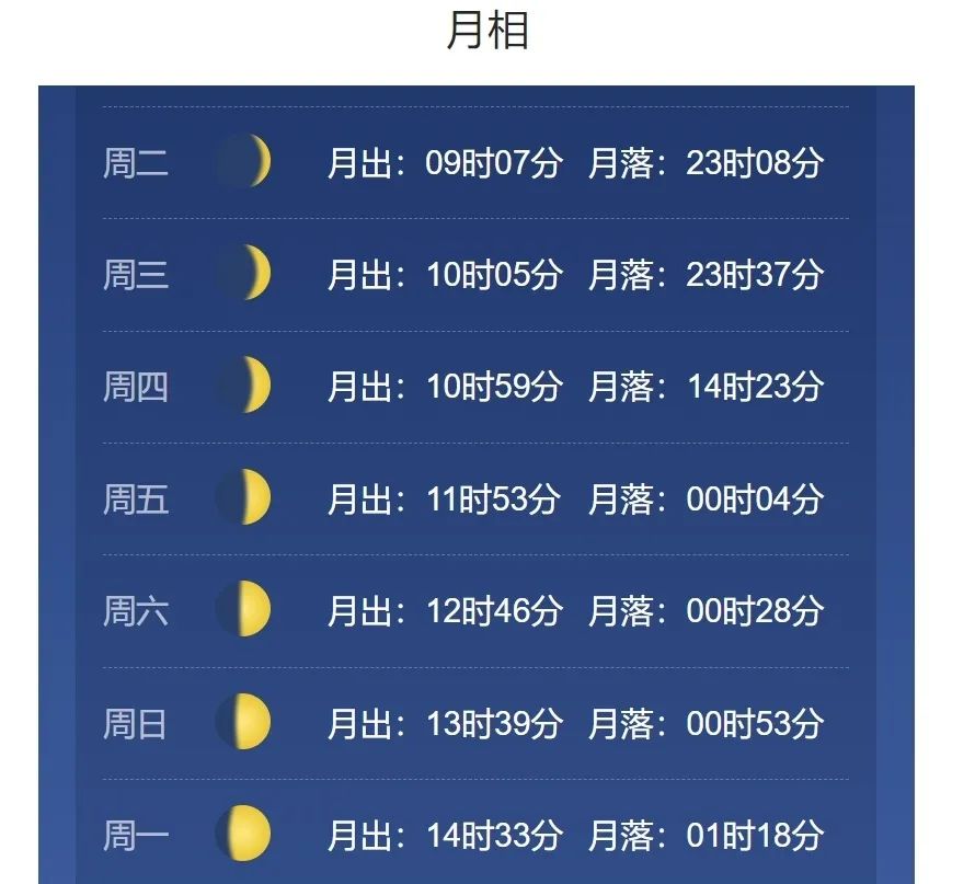图:接下去一周我所在地区月升月落时间,你也可以查看自己所在地区月升月落为什么有时候白天看不到月亮?