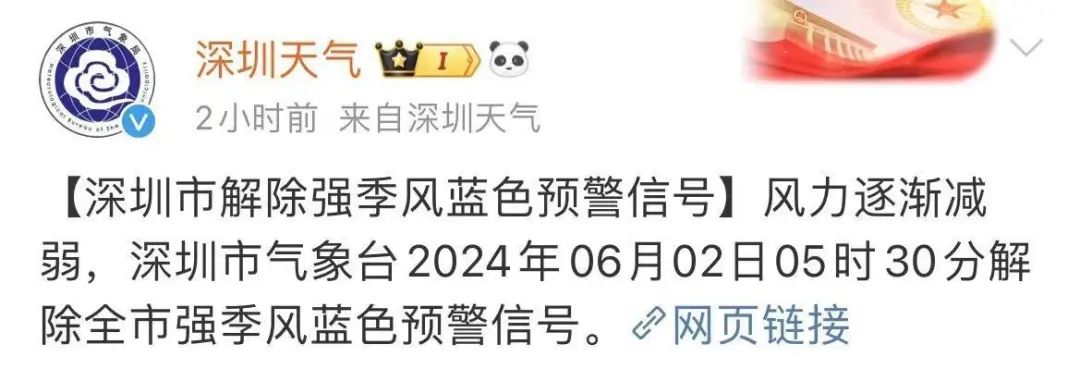 【深圳市解除强季风蓝色预警信号】随着风力逐渐减弱,深圳市气象台今天(6月2日5时30分)解除全市强季风蓝色预警信号。