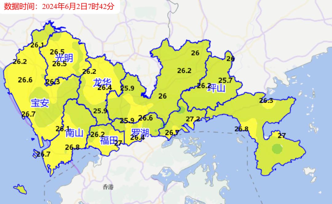 今天早晨6-9时,深圳阴天间多云,有短时阵雨,气温25-27℃,偏南风3-4级,沿海、海区和高地最大阵风6-7级,相对湿度85%-100%,能见度5-20公里,雨时能见度下降到3公里以下。