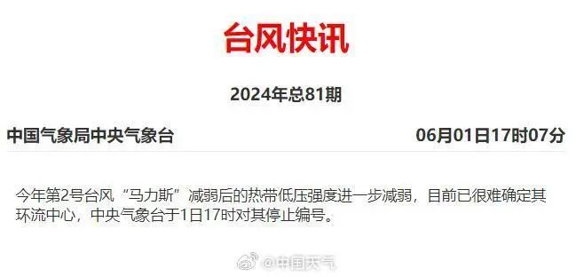 随着今年第2号台风“马力斯”减弱后的热带低压强度进一步减弱,中央气象台于昨天17时对其停止编号,台风“马力斯”对深圳影响也趋于结束。