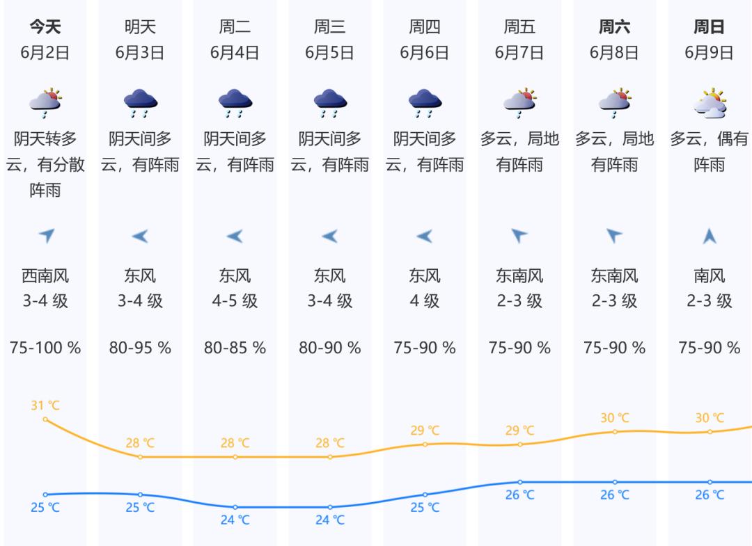 【今日天气】今天深圳阴天间多云,有短时阵雨,气温25-31℃,西南风3-4级,沿海、高地和海区阵风6-7级,相对湿度75%-100%。
