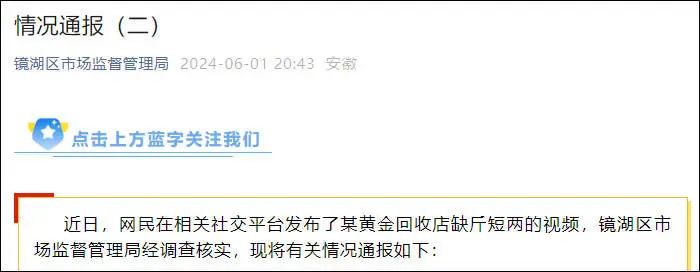 全文如下:近日,网民在相关社交平台发布了某黄金回收店缺斤短两的视频,镜湖区市场监督管理局经调查核实,现将有关情况通报如下: