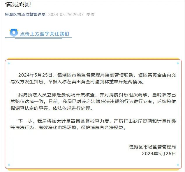 5月26日,“镜湖区市场监督管理局”发布情况通报称,5月25日,镜湖区市场监督管理局接到警情联动,辖区某黄金店内交易双方发生纠纷,举报人称在卖出黄金时遇到称重缺斤短两情况。该局执法人员立即赶赴现场开展核查,并对消费纠纷组织调解,当晚双方已就赔偿达成一致。目前,该局已对该店涉嫌违法违规的行为进行立案,后续将依据调查认定的事实,依法依规进行处理。