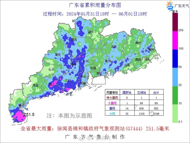 今天(6月1日)18时,过去24小时,湛江、阳江、江门、广州、佛山、珠海、中山、云浮、韶关、潮州部分市县出现100毫米以上雨量,徐闻累计雨量达到251.5毫米。今天夜间,粤北、珠三角及粤东地区降雨依旧频密,尤其是东部市县,海上仍有强降水云团上岸,仍需注意防范。