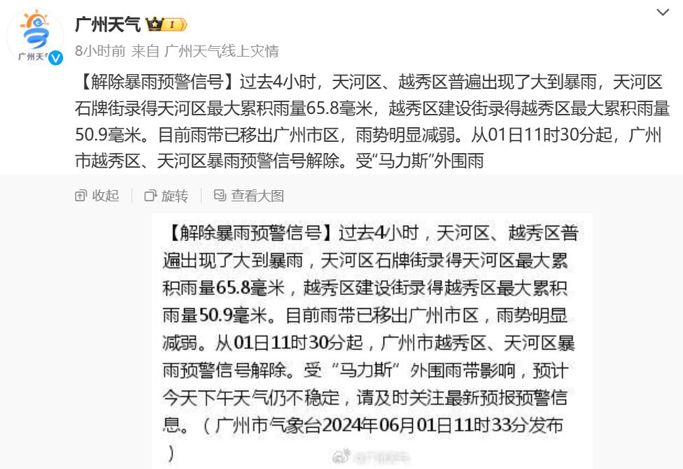 据广州市气象台监测,广州市达到解除气象灾害(台风)Ⅳ级应急响应标准。市气象灾害应急指挥部决定从1日18时36分起解除广州市气象灾害(台风)Ⅳ级应急响应。广州市气象灾害应急指挥部办公室2024年6月1日18时36分发布