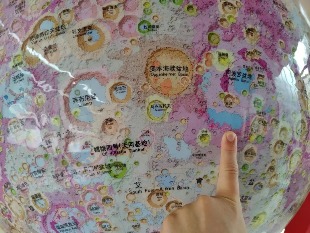 月球仪上的阿波罗盆地,手指位置为嫦娥六号预选着陆区附近。月球仪根据中国科学院地球化学研究所等单位联合绘制的 1:250 万月球地质图制作,直径约 1.55 米。图片来源:作者拍摄阿波罗盆地就位于南极-艾肯盆地内部的东北部,是一个多环撞击盆地,直径约 500km,在嫦娥二号全月影像图中非常醒目;而南极-艾肯盆地直径约 2500~3000km,由于过于巨大,且形成后经历了漫长的撞击、外来溅射物覆盖等侵蚀作用,其在影像上肉眼较难识别,需要月球高程、地形数据才能识别。